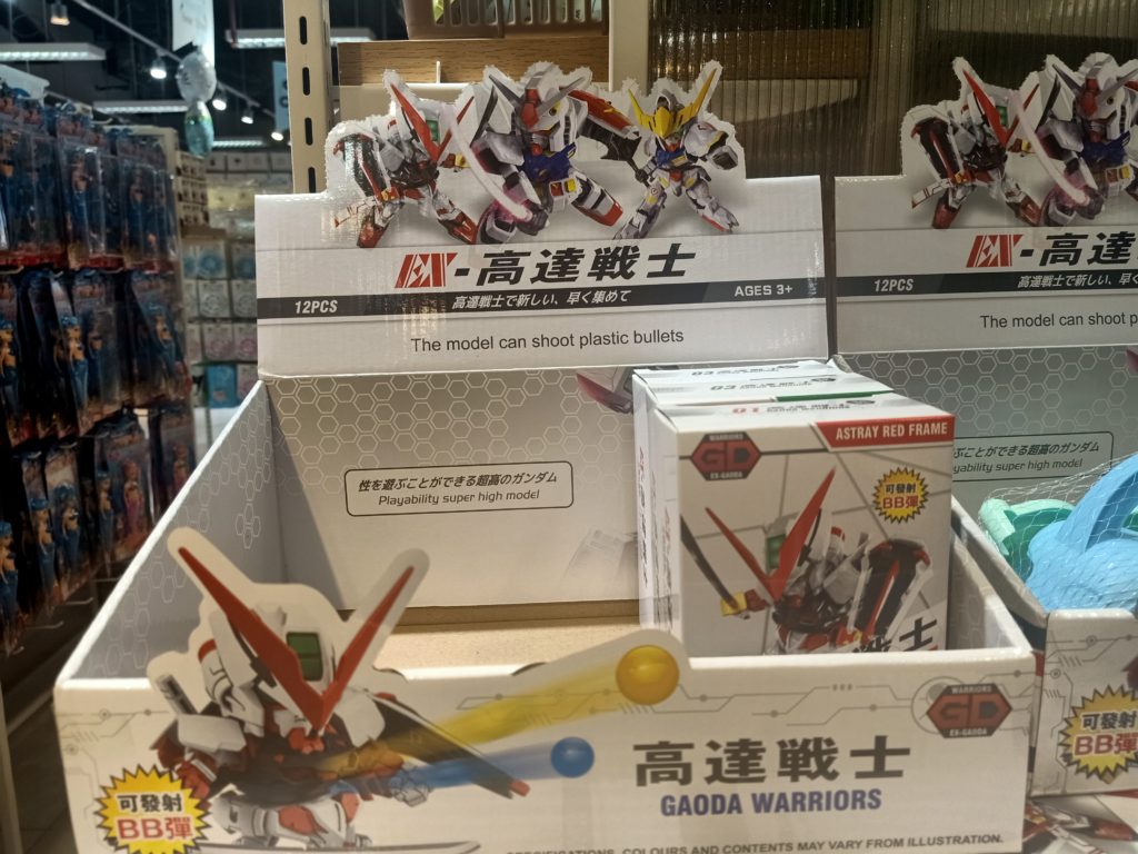 投稿日: 2020年1月24日2020年1月24日 投稿者: jpthailand20THBショップにガンダム!? 郊外の Zeer rangsit というショッピングモールを歩いていたらこんなのを見つけました 性を遊ぶことができる超高のガンダム。 高達戦士で新しい、早く集めて。 高達(Gaoda)って、中国語。 超高は、Super highの訳語ですね。 BB弾を発射できるのはちょっと面白そう。